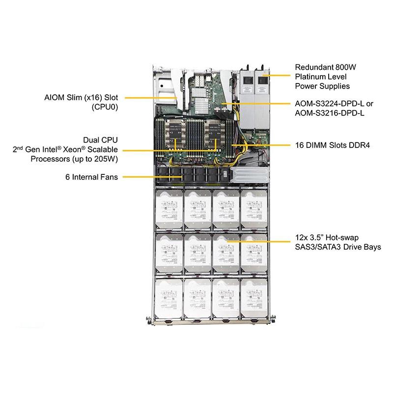 Barebone 1U SuperStorage Server with Dual Intel Xeon Scalable processor Gen. 2, support 12 Hot-Swap 3.5in SAS3/SATA3 drives, 2x 25Gb SFP28 onboard, Redundant Hot-swap 800W power supplies