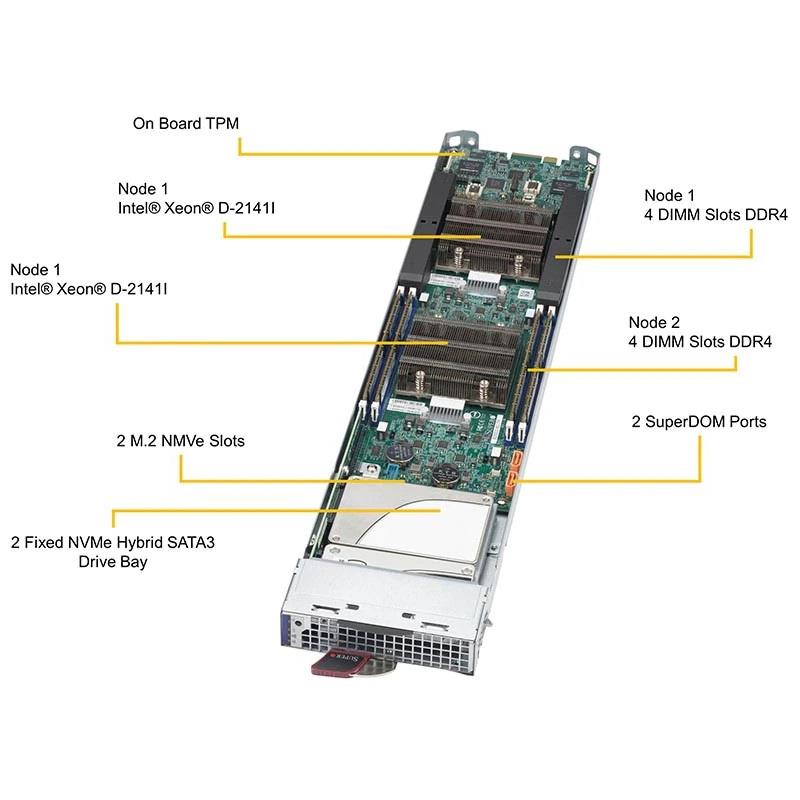 MicroBlade microServer with 2 independent nodes per Module - Each node Supports: Embedded Intel Xeon D-2141I Processor, 2.20GHz 8-Core/16 Thread. Up to 128GB DDR4-2133MHz RDIMM in 2 DIMM slots, onboard System-on-Chip chipset, 1x 2.5in HDD/SSD/NVMe U.2 per node, 1x NVMe M.2 (60/80/110mm), Dual 10GbE LAN ports, 1x SATA DOM - BLADE ONLY