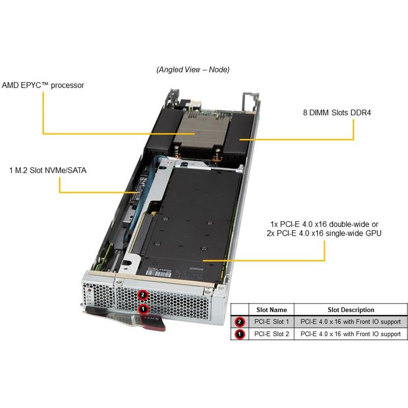 SuperBlade Supports Single Socket SP3, Supporting AMD EPYC 7003/7002 Series Processor, Support CPU TDP up to 280W (Up to 64 Core), (The latest AMD EPYC 7003 Series Processor with AMD 3D V-Cache Technology requires BIOS version 2.3 or newer). System on Chip, Up to 2TB in 8 DIMM slots, R/LRDIMM, SAS3/SATA3 Provided via Mezzanine card, 1x NVMe/SATA3 M.2, Dual 25G LAN via Mellanox CX4, 1x IPMI via Chassis Management Module (CMM) - (SBA-4119SG + Super BH12SSi-M25)
