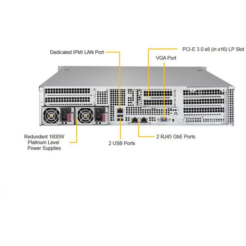 Server Barebone 2U for Dual Intel Xeon processor E5-2600 v4/v3 family, GPU/Xeon Phi Support K1/K2/K10/K40/K80/M40/M60/Xeon Phi - Supports up to 2TB DDR4 ECC LRDIMM up to 2400MHz in 16x 288-pin sockets - On-Board: SATA3 6Gbps ( RAID 0, 1, 5, 10), IPMI 2.0, Intel i350 2x Gigabit Ethernet, VGA - Includes: 6x PCI-E 3.0 x16 slots (support GPU/Xeon Phi cards, option), 1x PCI-E 3.0 x8 (in x16) low-profile slot, 10x 2.5in Hot-swap drive bays, 4x Riser Cards (1x RSC-G2B-A66, 1x RSC-G2F-A66, 1x RSC-G2FR-A66, 1x RSC-R2UG-E16R-X9), 2x Heatsinks (1x SNK-P0047PS and 1x SNK-P0048PS), 2000W Redundant 80 Plus Platinum Power Supply (2x PWS-2K03P-1R), X10DRG-H Motherboard and SC218GH-R2K03B 2U Chasssis (Black)