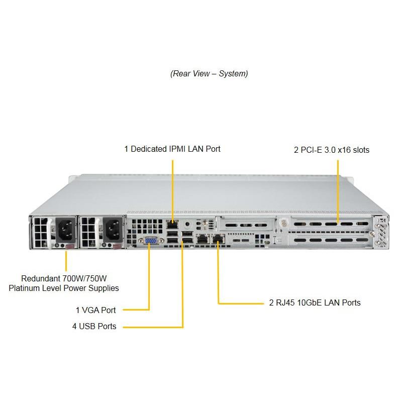 Server Barebone 1U with Dual Intel Xeon E5-2600 v4/v3 Sockets, supporting up to 2TB DDR4 ECC LRDIMM, up to 2400MHz in 16x 288-pin slots - On-Board : SATA3 6Gbps (RAID 0, 1, 5, 10), IPMI 2.0, Intel X540 2x 10GBase-T Ethernet, VGA - Includes : 8x SATA3 (6Gbps) ports and 2x NVMe/STAT3 hybrid ports (connected to onboard storage controller), 1x Riser Card (RSC-R1UW-2E16), 2x Heatsinks (1x SNK-P0047PSC and 1x SNK-P0057PS), 750W Redundant 80 Plus Platinum Level Power Supply (2x PWS-706P-1R), MBD-X10DRW-NT Motherboard, SC116AC2-R706WB 1U Chassis (Black)