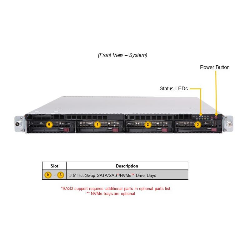 6. Drive Bays: 4 hot-swap 3.5" SATA3 by default or 4 NVMe (via optional drive tray) or 4 SAS3 (via optional SAS kit)