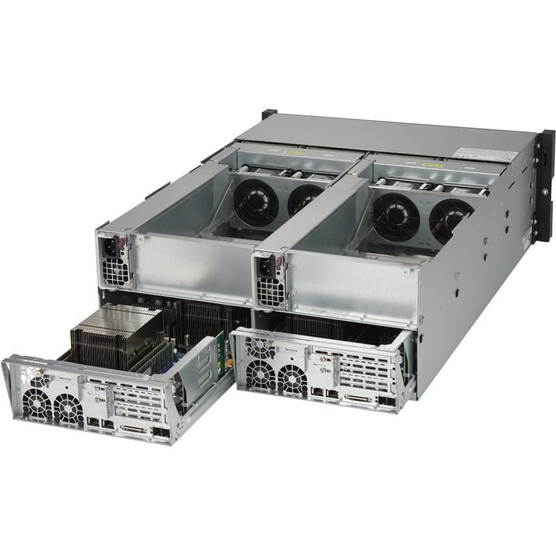Barebone 4U SuperStorage Server with Two Nodes - Supports (per Node) : up to two Intel Xeon E5-2600 v4/v3 processors, up to 1.0TB DDR4 ECC 3DS LRDIMM up to 2400MHz, in 8x 288-pin slots - On-Board (per Node) : Intel C612 chipset, SAS3 12Gbps via LSI 3008, SATA3 6Gbps (RAID 0, 1, 5, 10), 2x 10GBase-T LAN with Intel X540 Ethernet Controller, IPMI 2.0, VGA - System includes : 24x 3.5in Hot-swap SAS drive bays with SES2, 4x Heatsinks (SNK-P0048PS), 1600W Redundant 80 Plus Titanium Power Supply (2x PWS-1K68A-1R), MBD-X10DRS-4U 4U Motherboard, SC947ETS-R0NDBP 4U Chassis (Black)
