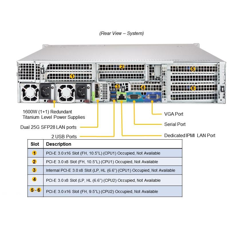 | Network Connectivity | Dual 25GbE SFP28 ports via AOC-2UR68-M2TS-O (Mellanox ConnectX-4 Lx EN) | |