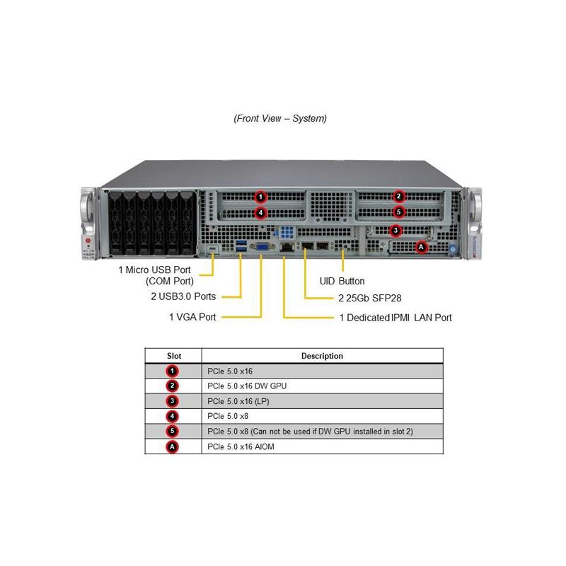 3. Supports 1 PCIe 5.0 x16 Double Wide FPFL GPU Card (or 1 PCIe 5.0 x16 FPFL Single Slot and 1 PCIe 5.0 x8 FPFL Single Slot), 1 PCIe 5.0 x16 FPHL Slot, 1 PCIe 5.0 x8 FPHL Slot, 1 PCIe 5.0 x16 LP Slot, 1 AIOM Slot (OCP3.0 Mezzanine Compatible)